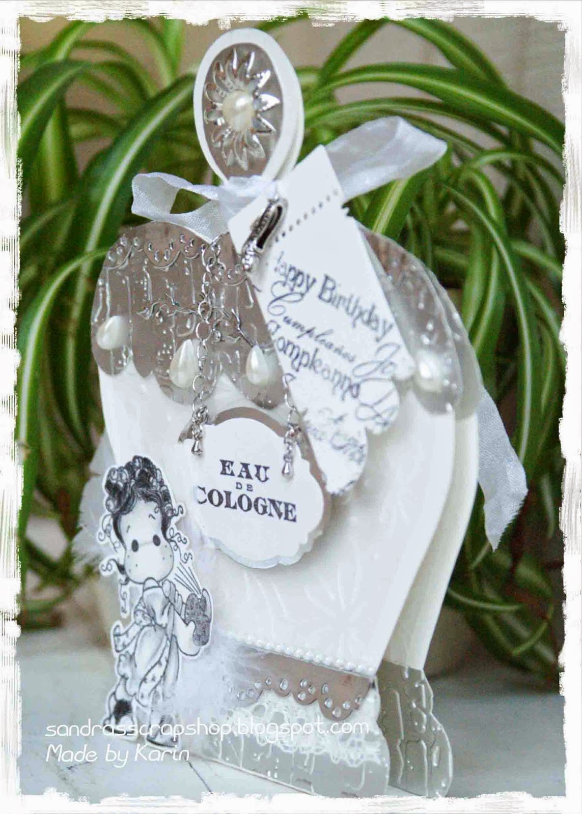 Het patroon bestaat uit twee delen en die kan je openklappen. Binnen in kan je er een doosje in maken (zit ook bij het patroon) voor een kleine inhoud. Ik heb mijn parfumflesje als een kaart gemaakt die je open kan klappen.